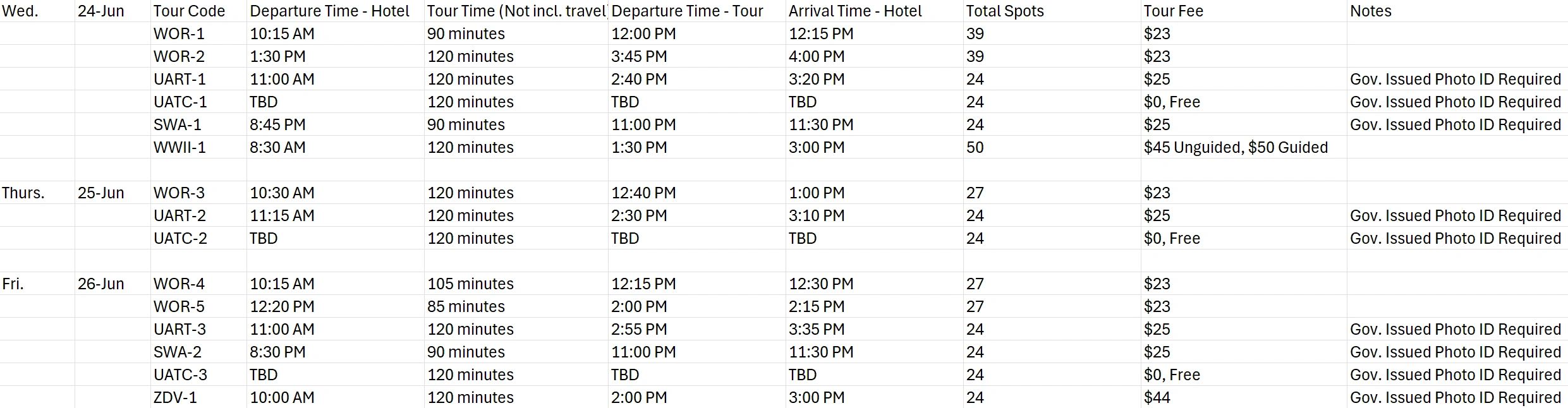 All tour bookings subject to possible cancellation or changes if airport/airline security concerns change significantly by showtime or if minimum tour booking participants are not met.